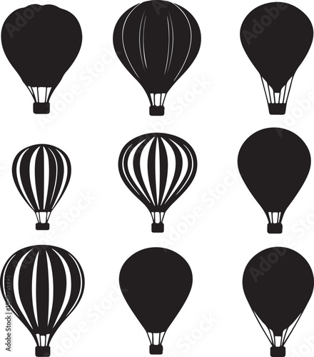 balloon, air, flight, sky, black, white, silhouette, vector, illustration, floating, up, journey, adventure, travel, freedom, celebration, graphic, design, pattern, stripes, shape, round, sphere, basket, cord, rope, vintage, retro, classic, simple, elegant, minimalist, symbol, icon, art, style, collection, group, 9, set, isolated, object, element, decorative, artistic, drawing, outline, monochrome