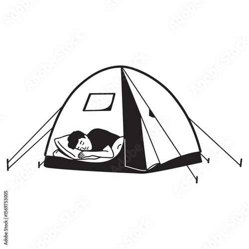 Black and white illustration of a person sleeping comfortably inside a tent outdoors