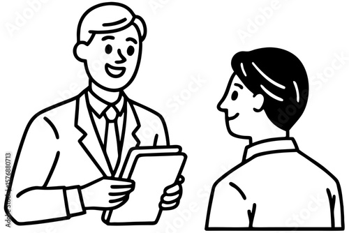 Black and White Illustration of Businessperson in Suit Holding Clipboard and Speaking to Colleague – Communication, Management, and Workplace Interaction Concept