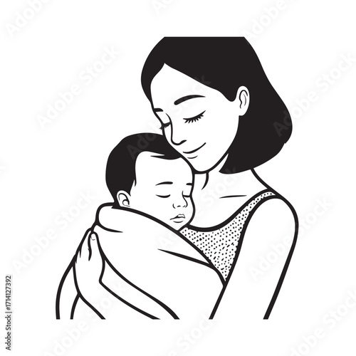 Black and white line art of a beautiful mother lovingly embracing her baby minimalist tender illustration