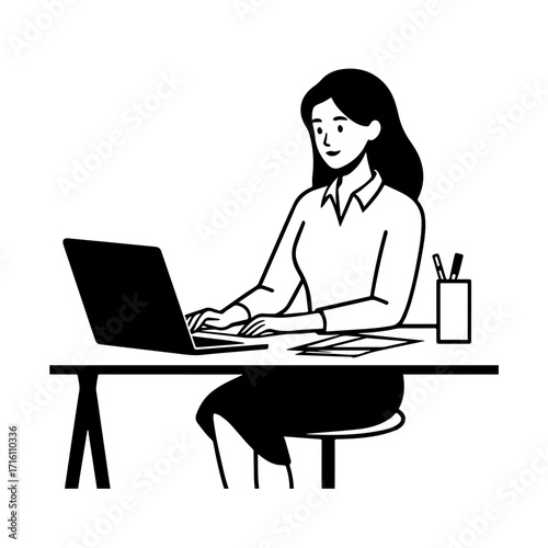 Black and white line art of a beautiful successful career woman working at desk with laptop illustration