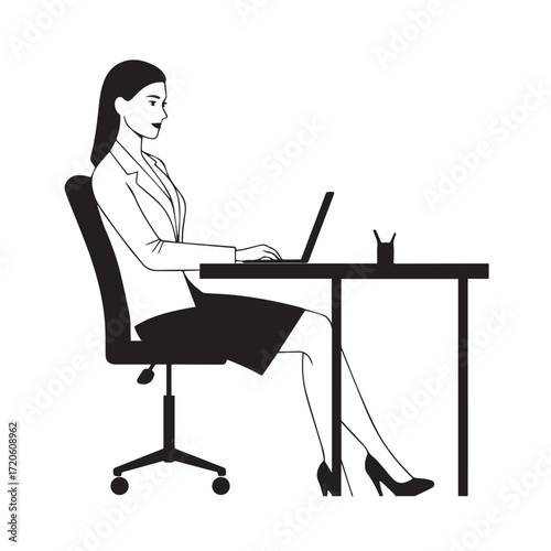 Black and white line art of a beautiful successful career woman working at desk with laptop illustration