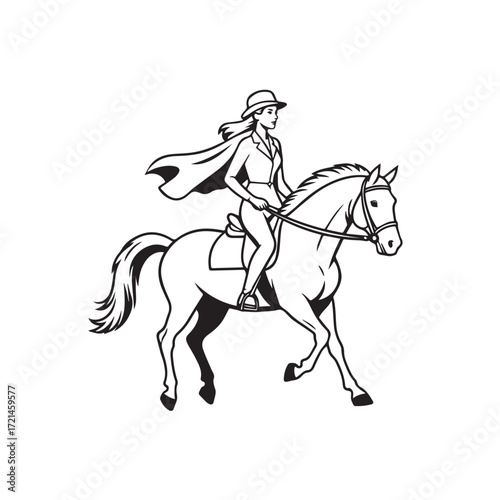 woman, horse, riding, equestrian, beautiful, body, elegant, stylish, outfit, vector, illustration, line art, black, white, drawing, vignetting, outline, silhouette, graceful, confident, minimal, minimalist, simple, chic, fashion, strong, female, rider, horseback, lifestyle, graphic, design, modern, artwork, aesthetic, decorative, posh, posture, athletic, feminine, contemporary, sport, leisure, stable, countryside, charming, equine, composition