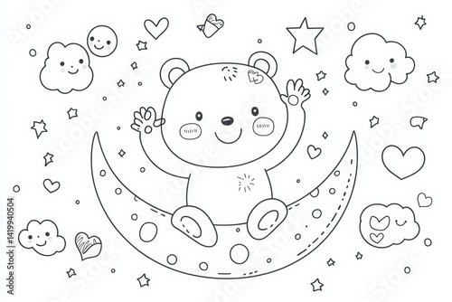 bear, moon, star, cloud, night, sky, cute, cartoon, doodle, drawing, art, children, children, baby, animal, sleep, bedtime, waving, nubes, fun, smiling, peaceful, illustration, colouring, happy, black, white, magic, dreamy, fantasy, vector, pattern, vignetting, floral, decoration, cat, design, flower, funny, set, frame