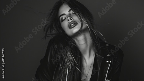 Black and white Portrait of a brunette woman in leather jacket, fashion and make-up shoot. Dark style fashion. Dark smokey make-up. Dramatic. Elegant.
