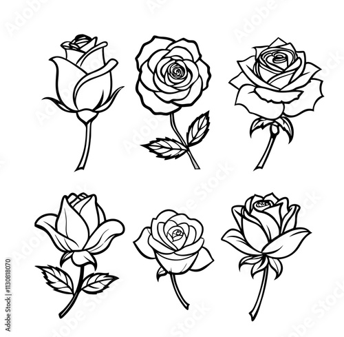 black and white roses. Rose flowers set . Vector illustration silhouette