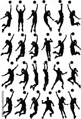 Black and white silhouette illustration featuring dynamic athletes jumping and reaching for ball in volleyball or basketball poses, arranged in grid format for design projects