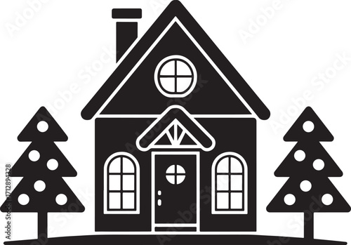 Black and white silhouette of cozy house with decorated Christmas trees, perfect for holiday designs and decor.