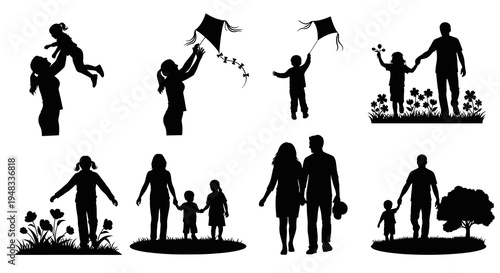 Black and white silhouettes of families enjoying outdoor activities, diverse poses