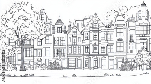 row house, european, architecture, vignetting, drawing, black, white, tree, house, building, city landscape, urban, street, park, landscape, illustration, colouring, book, print, design, line, art, detail, simple, elegant, outdoors, background, vector, modern, classic, vintage, city, perspective, doodle, decor, image