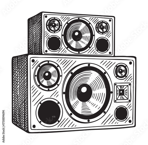 Black and white sketch of two stacked speaker boxes featuring detailed circular patterns and design elements.