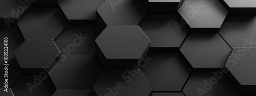 Black background with hexagons for design, banner template. White space in the center of the page for text. Geometric pattern wallpaper with copy space.