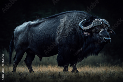 Black buffalo side profile, majestic stance, dusk lighting 32k, full ultra hd, high resolution