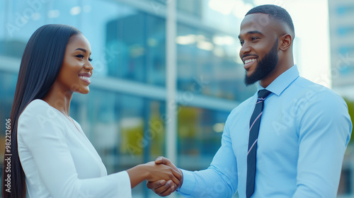 Black Business People Shaking Hands in Front of an Office, African American Businesswoman and Businessman Handshake in Team Meeting, DEI-Focused Hiring, Closing the Deal, Making Agreement.