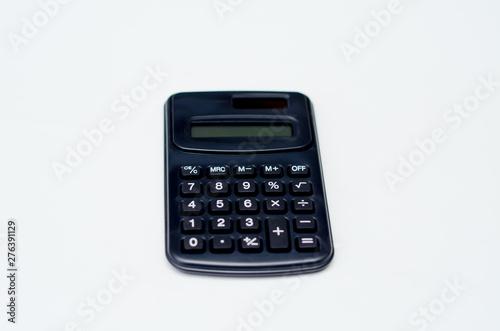 Black calculator placed isolated on a white background.Copy space.