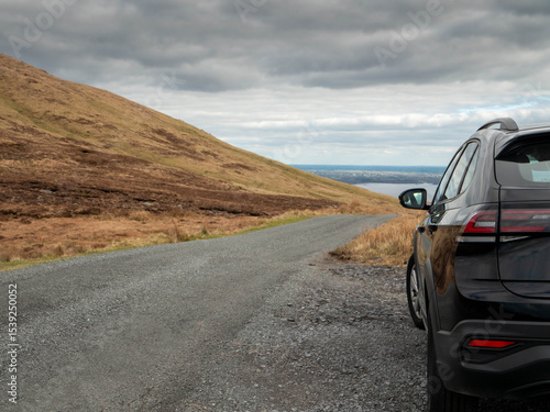 Black car parked off small asphalt country road, huge fields with brown grass surrounds the car, low dramatic cloudy sky. West Ireland. Travel and tourism. Irish nature scene.