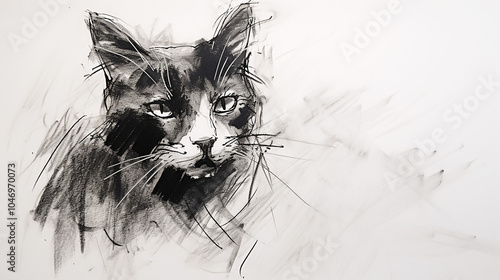 Black charcoal pencil closeup line illustration drawing of portrait of a cat in white background