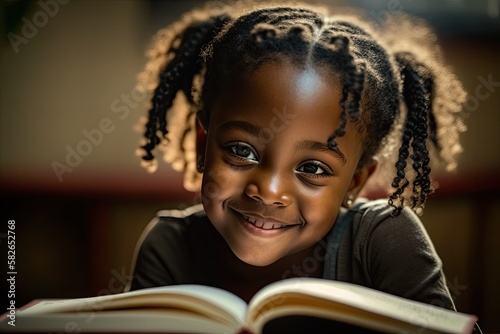 portrait, black, children, girl, reading, book, smiling, face, happy, study, novel, imagination, cheerful, culture, home, interior, natural, light, shot, casual attire, clothing, ai, generative, enjoy, lifestyle
