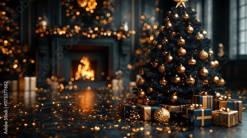 Black Christmas tree with gold ornaments, presents, and fireplace.