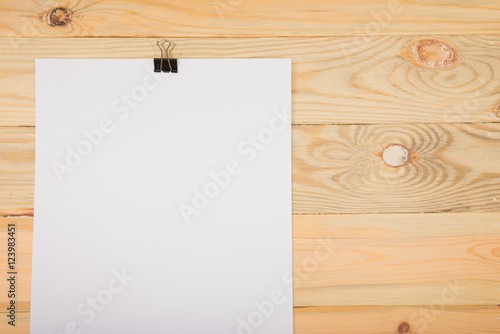 Black clip and White blank note paper hang on wood pane