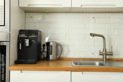 Black coffee machine and kettle on the table in the kitchen