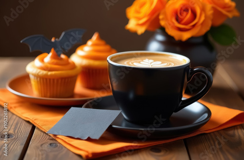 black, cup, hot drink, cappuccino, halloween, bouquet, orange, rose, cafes, breakfast, cupcake, cream, chocolate, bat, hot, espresso, latte, nubes, drink, caffeine, festive, beverage, brown, milk, mug, table, morning, foam, aroma, style, closeup, food, view, background, art, wood, top, mocha, wooden, dark, vintage, saucer, design, fresh, tasty, sweet, white, spoon