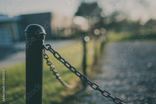 Black fence with chains and pillars with intentional blurred background