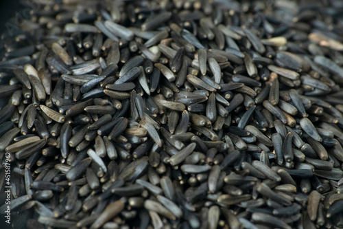 Black flax seeds, Linum usitatissimum macro closeup, Satara, Maharashtra, India
