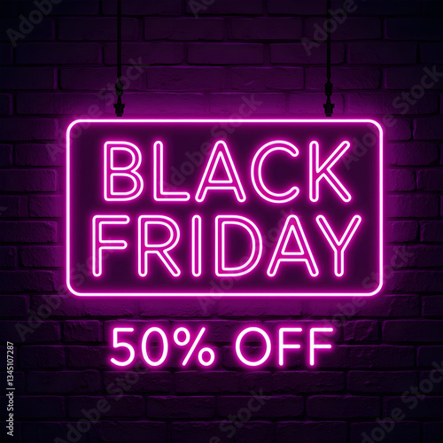 Black Friday Neon Sign with 50% Off.A vibrant pink neon sign advertising Black Friday with a 50% discount, displayed against a dark brick wall.