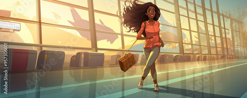 Black girl holding ticket for aircraft in airport hall. copy space for text. illustrative picture.
