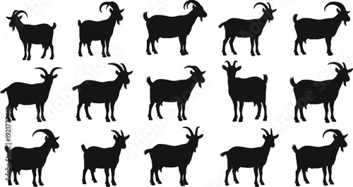 Black Goat Silhouette Vector Set Featuring Various Farm Animal Poses and Horn Shapes Isolated on White Background for Livestock Logo Design and Rural Graphics