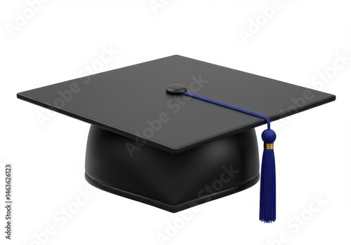 Black graduation cap with blue tassel isolated on white background, academic achievement