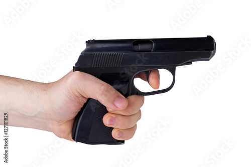 hand, gun, hold, weapon, black, closeup, handgun, white, background, handgun, trigger, murder, murderer, isolated, human, aiming, wrist, thumb, steel, concept, shot, arm, military, killer, people, security, closeup, revolver, bullet, man, crime, safety, metallic, person, gesture, assistance, army, danger, single, criminal, gesticulate, metal