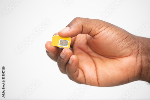 black Hand holding yellow SIM card over white background