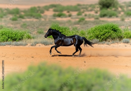horse, black horse, desert, landscape, arid, sand, shrub, wildlife, animal, equine, mammal, nature, photo, daytime, sunshine, bright, sunlight, shadow, motion, speed, energy, power, wild, free, brown, tan, green, plant, bush, habitat, environment, desert landscape, natural light, scenic, beautiful, majestic, powerful, elegant