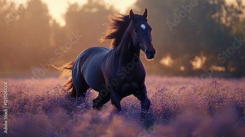 horse, running, lavandula, field, sunset, black, nature, animal, beauty, freedom, equine, majestic, power, speed, grace, energy, wild, strong, vibrant, purple, summer, rural, landscape, outdoors, tranquil, peaceful, serenity, elegance, galloping, pasture, meadow, farm, countryside, dawn, dusk, photo, image, picture, wildlife, photograph