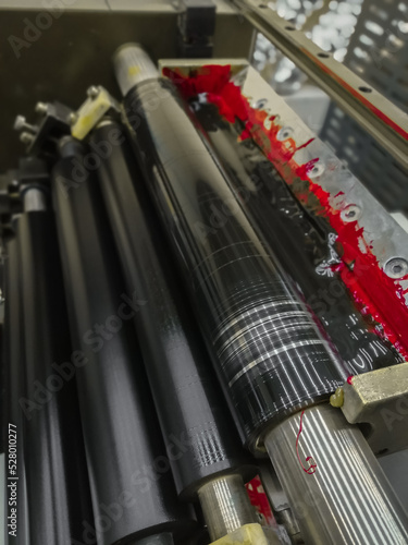Black ink in the paint system compartment of a modern flexographic printing press in a print shop. Black paint in the ink feeder on the printing cylinder. Selective focus