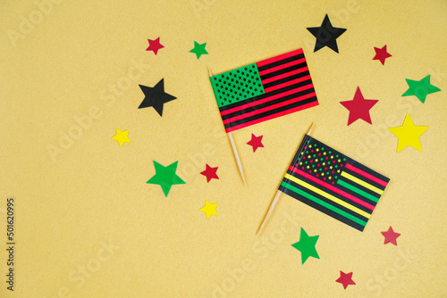 Black Liberation African American flags and stars on yellow background. Black History Month. 19th of july, Juneteenth African American Holiday Celebrating Freedom