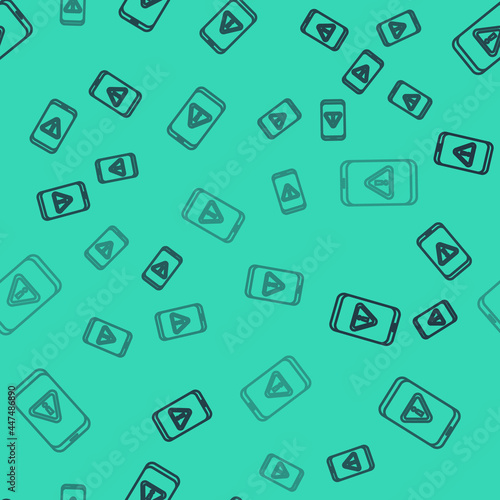 Black line Mobile phone with exclamation mark icon isolated seamless pattern on green background. Alert message smartphone notification. Vector