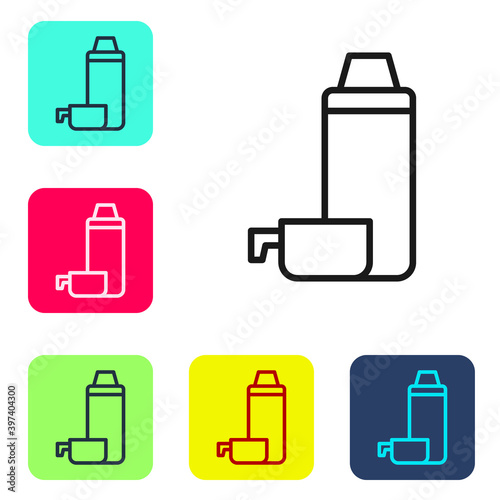 Black line Thermos container icon isolated on white background. Thermo flask icon. Camping and hiking equipment. Set icons in color square buttons. Vector.