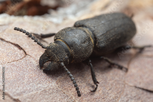 Black longhorn beetle, spondylis buprestoides cowered in sawdust on pine bark
