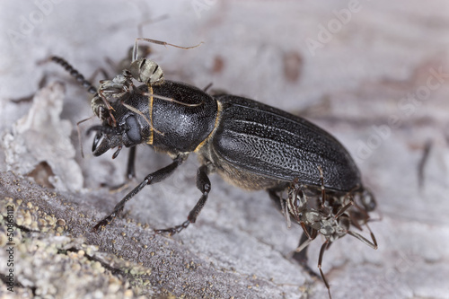 Black longicorn beetle, Spondylis buprestoides attacked by ants