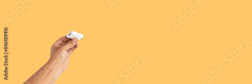 Black male hand holding a USB charger plug isolated on yellow banner background