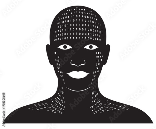 black man, binary code, face, skin, digital, technology, coding, computer, futuristic, illustration, vector, graphic, design, pattern, code, datum, virtual, cyber, artificial intelligence, robotic, dark, isolated, white background, closeup, portrait, human, person, emotionless, expressionless, bald, eye, nose, mouth, lip