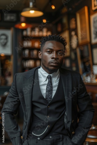 black, man, suit, attaching, standing, bar, dark, background, white, shirt, patterned, shelf, light, blurry, portrait, fashion, style, businessman, formal, wear, professional, indoor, masculine, confident, photogenic, elegant, dapper, cool, casual attire, modern, vintage, trendy, sophisticated, sharp, clean, edgy, urban, street, relaxed, serious, expression, mood, atmosphere, vibe, energy, composition, lighting, shadow, contrast
