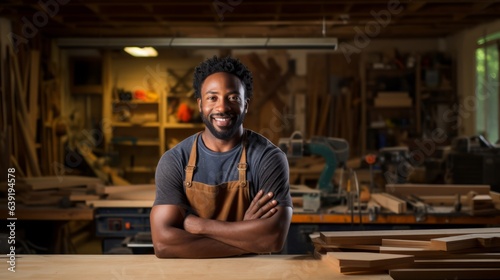 Black man in the room with wooden planks, worker. Beautiful illustration picture. Generative AI
