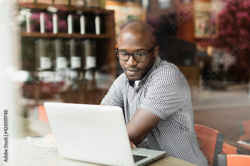 access, aspiration, bald, cafes, city, city life, cafes, color image, communication, connection, convenience, croissant, day, electronic mail, electronic mail, entrepreneur, eyeglass, horizontal, indoor, cyberspace, laptop, lifestyle, looking down, man, mobility, one person, online, people, phone, photo, planning, selective focus, sitting, small business, success, technology, urban, waist up, window, wireless technology, work, young adult, young men, minority