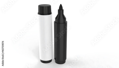 marker, black, white, pen, writing, drawing, art, design, office, school, student, supply, education, tool, product, graphic, illustration, three-dimensional, render, isolated, cylinder, container, cap, tip, ink, portable, functional, equipment, stationary, presentation, digital, modern, minimalist, branding, advertising, cardboard box, promotion, visual