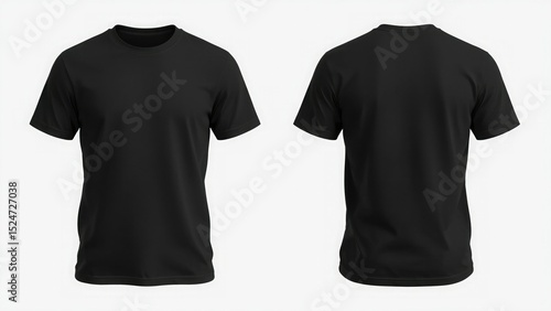 t-shirt, t-shirt, tee, black, short, sleeve, template, design, clothing, apparel, fashion, front, back, view, isolated, white, background, realistic, three-dimensional, rendering, casual attire, style, cotton, fabric, blank, plain, unisex, graphic, print, illustration, product, presentation, e-business