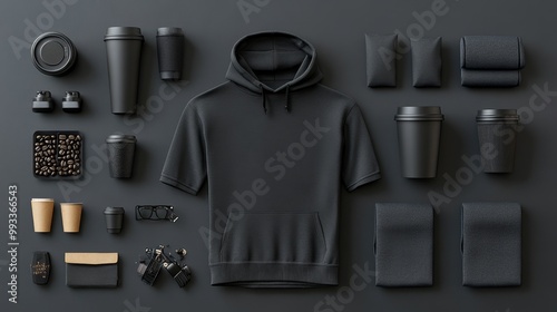 black, design, branding, template, hot drink, hoodie, activewear, apparel, coffee cup, coffee bean, goggles, billfold, minimalist, style, modern